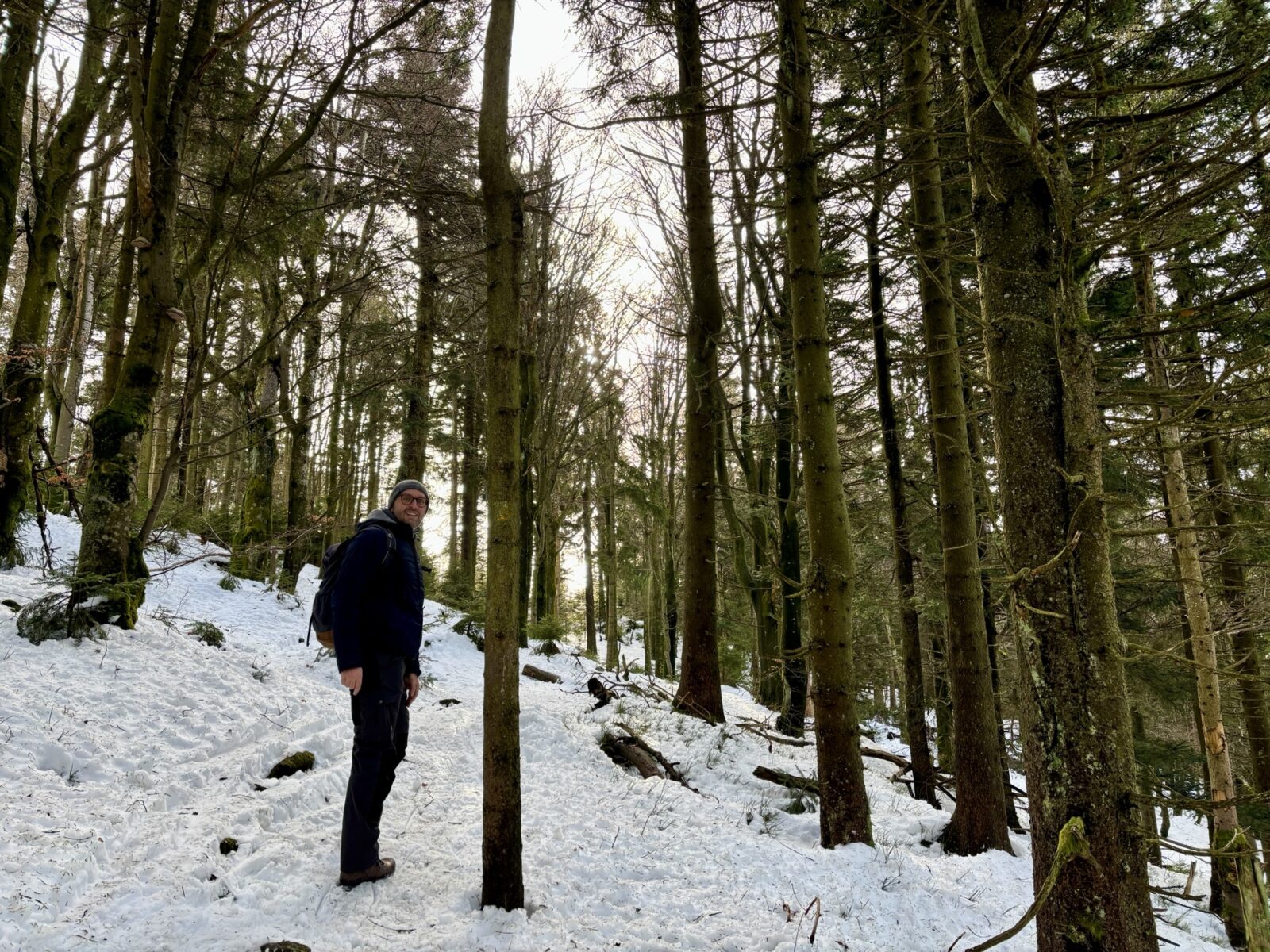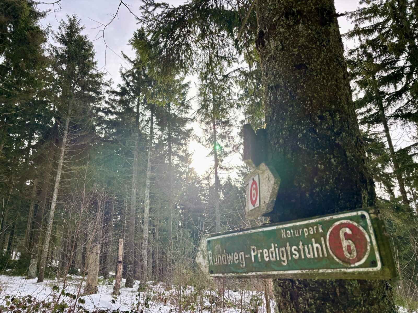 Zurück geht es bis zum Hochberg auf gleicher Strecke. Dann halten wir uns rechts und sind wieder auf dem Rundweg sechs unterwegs. Nächster Stopp ist kurze Zeit später der Predigtstuhl. Davor finden sich ein paar Felder, die mit Schnee bedeckt sind. Außerhalb des Winters finden sich hier Wacholderbüsche.