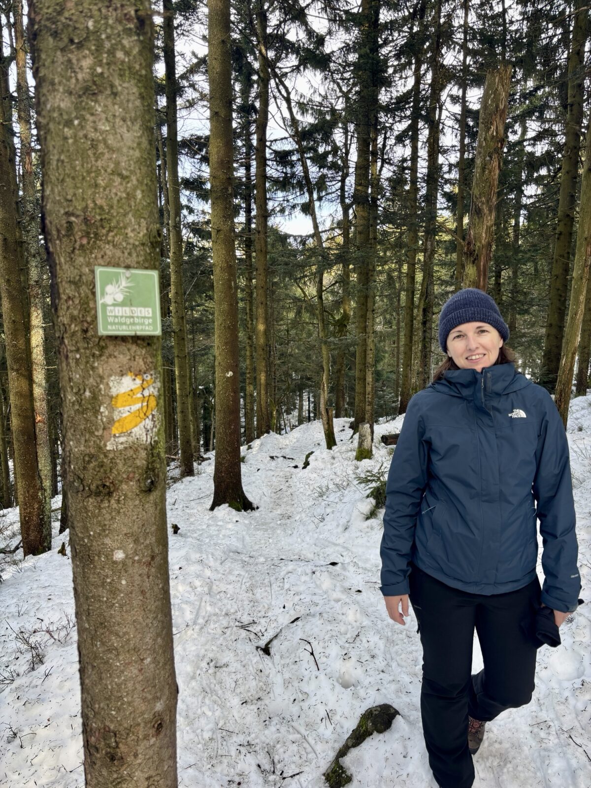 Es geht über einen schmalen Pfad durch den Wald. Die Sonne kommt immer mehr heraus und ragt schön durch die Bäume hindurch. Auf dem Schnee lässt es sich gut gehen. Nur an ein paar Stellen ist er schon sehr nass und abgetreten. Am Hochberg kommen wir an einer schönen Stelle vorbei, an der sich auch eine Liegebank befindet. Sie ist noch stark mit Schnee bedeckt, sonst hätten wir uns sicherlich mit schöner Waldsicht und Sonnenschein darauf niedergelassen.